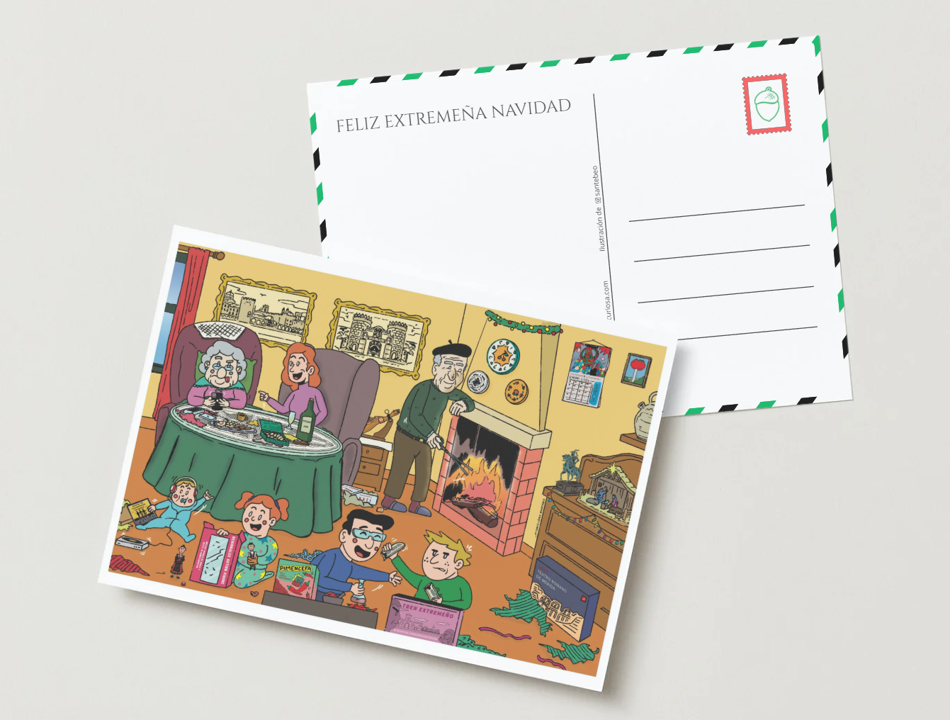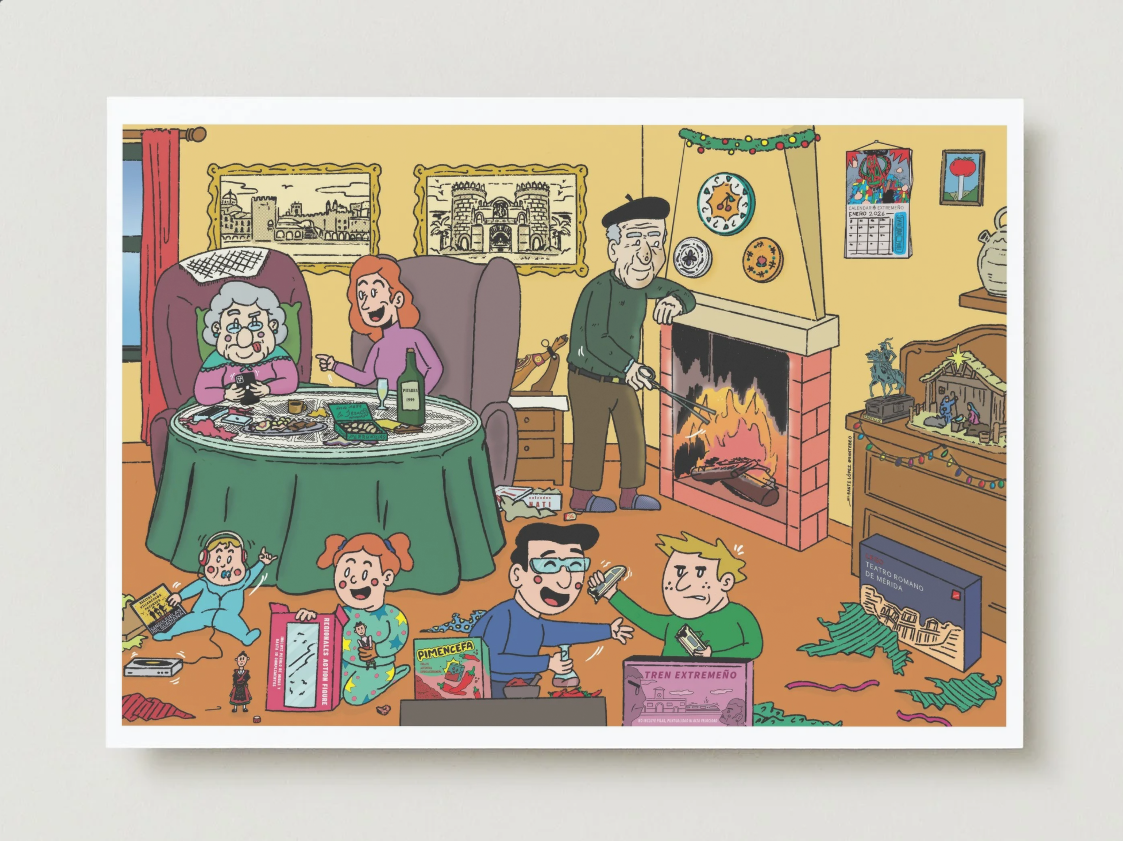Desde un niño estrenando su tren extremeño que no incluye pilas, puntualidad ni alta velocidad, hasta una hija enseñando a su madre a usar su nuevo móvil sentadas en la mesa camilla… con esta postal cargada de humor y mucho acento extremeño podrás felicitar las fiestas a tus seres queridos.